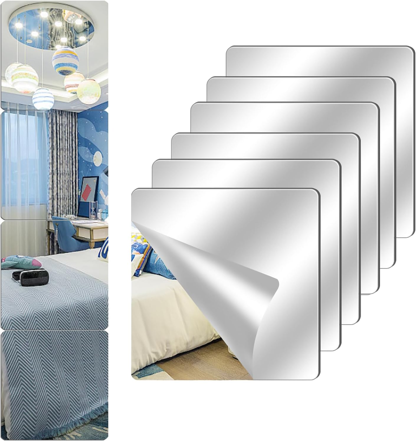 Acrylic wall mirror tiles set comes with 6 pieces of self-adhesive mirror wall stickers, The size of mirror is 8 x 8 inch ,thickness: about 2mm. it looks clearer, more structured and realistic. Use your imagination to arrange the mirror stickers into different shapes for decorating the wall.