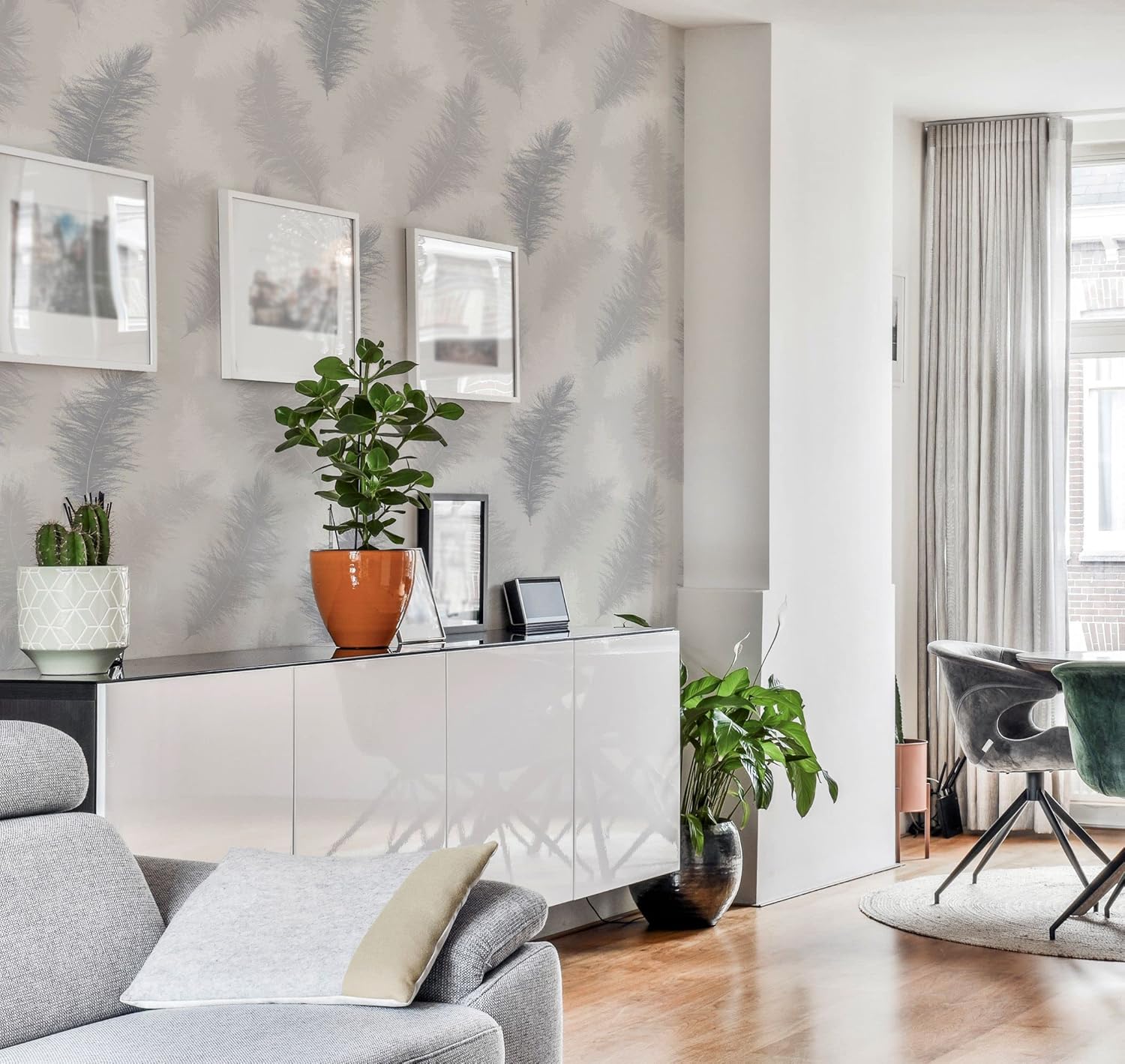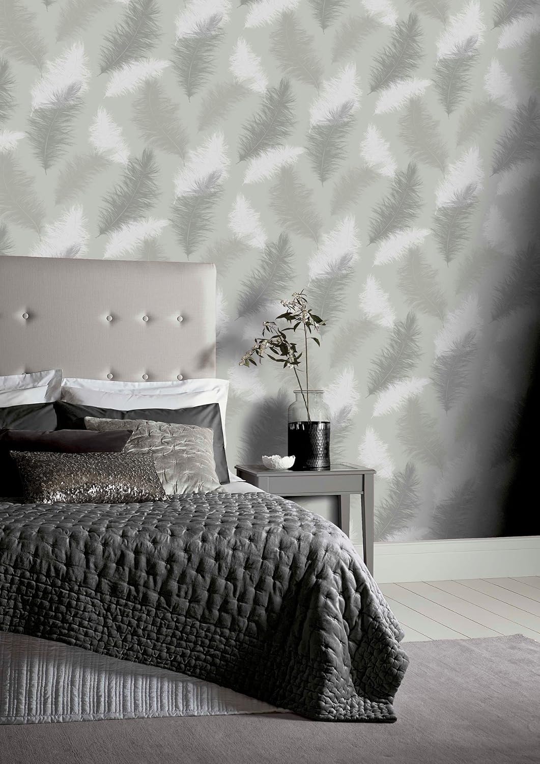 A fabulously eye catching wallpaper in an on-trend design and fashionable mix of colours It contrasts a matt grey background with subtly sparkling gel effect feathers for a touch of luxury A large-scale print it will add impact and accentuate the sense of space in your room Whether your home is contemporary or classic in style this paper will create a stunning feature wall in a bedroom or living room Suitable for most rooms except high moisture environments like bathrooms Suitable for most rooms except high moisture environments like bathrooms