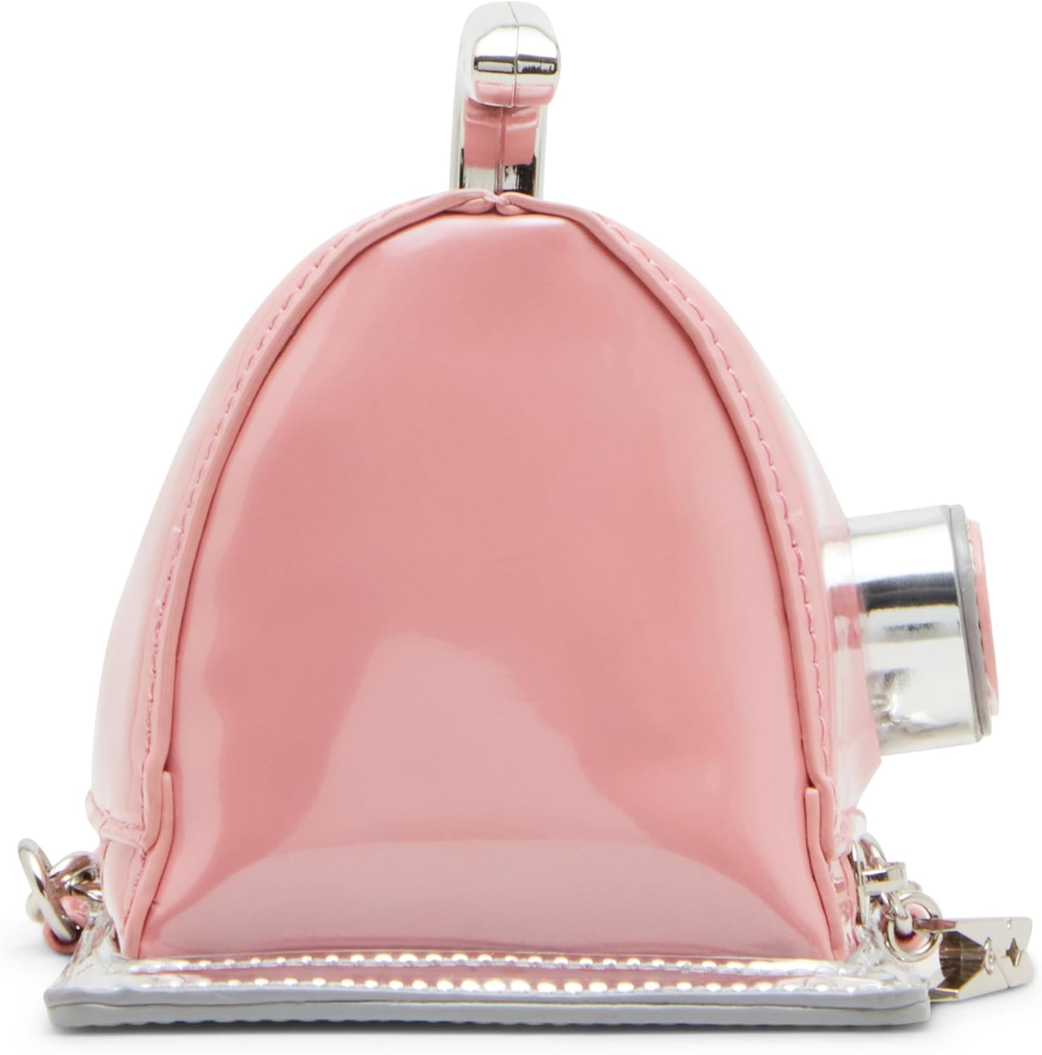 This crossbody has a vintage feel. It is shaped like an iron with a pink patent exterior.