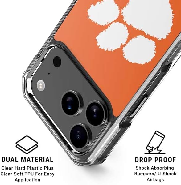 The Clemson University Tiger Print Clear Case compatible with iPhone 17 Pro Max offers a protective solution crafted from transparent materials. This Clemson University Tiger Print design shields your smartphone from the rigors of daily life, including dust, scratches, and wear and tear. With a 4 Corner Air-Pocket Shock Bumper and a raised front bezel, this Clemson University Clear Case compatible with iPhone 17 Pro Max not only safeguards your device but also does so in a stylish and minimalist fashion, providing extra protection for your phone's screen. To top it off, the Case is adorned with a 3M vinyl decal skin compatible with iPhone 17 Pro Max on the back, ensuring that this Clemson University Clear Case compatible with iPhone 17 Pro Max not only offers protection but also presents a visually appealing look for your smartphone.