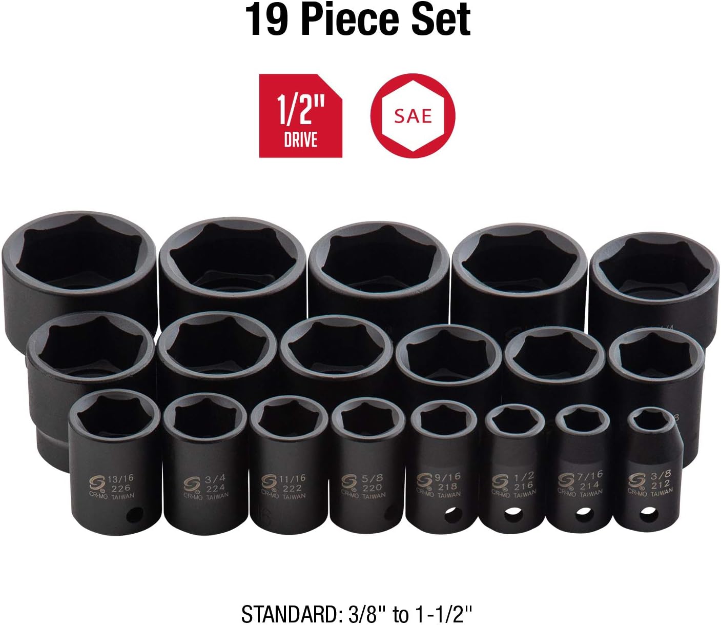 Sunex 2641, 1/2 Inch Drive Deep Impact Socket Set, 19-Piece, SAE, 3/8" - 1-1/2", Cr-Mo Alloy Steel, Radius Corner Design, Dual Size Markings, Heavy Duty Storage CaseThis Sunex 1/2 inch drive deep 19 piece SAE impact socket set includes the most common sizes used for automotive repair. It includes 19 SAE sockets. It is made of CR-MO alloy steel for long life. It is fully guaranteed and includes a heavy duty blow molded storage case. Set includes in SAE inches: 3/8, 7/16, 1/2, 9/16, 5/8, 11/16, 3/4, 13/16, 7/8, 15/16, 1, 1-1/16, 1-1/8, 1-3/16, 1-1/4, 1-5/16, 1-3/8, 1-7/16, 1-1/2.Sunex 2640, 1/2 Inch Drive Impact Socket Set, 19-Piece, SAE, 3/8 Inch – 1-1/2 Inch, Cr-Mo Alloy Steel, Radius Corner Design, Dual Size Markings, Heavy Duty Storage Case, Meets ANSI StandardsThis Sunex 1/2 inch drive 19 piece SAE impact socket set includes the most common sizes used for automotive repair. It includes 19 SAE sockets. It is made of CR-MO alloy steel for long life. It is fully guaranteed and includes a heavy duty blow molded storage case. Set includes in SAE inches: 3/8, 7/16, 1/2, 9/16, 5/8, 11/16, 3/4, 13/16, 7/8, 15/16, 1, 1-1/16, 1-1/8, 1-3/16, 1-1/4, 1-5/16, 1-3/8, 1-7/16, 1-1/2.The Sunex 2640, 1/2” Drive Impact Socket Set includes SAE sizes from 3/8” to 1 1/2” in standard lengths. Each socket has been forged from high grade Cr-Mo steel, designed with radius corners, made with chamfered openings, and marked by both laser etching and roll stamping to ensure permanent socket identification. All of this ensures our sockets’ professional-level performance--conveniently stored in one heavy duty storage case. Meets ANSI Standards.