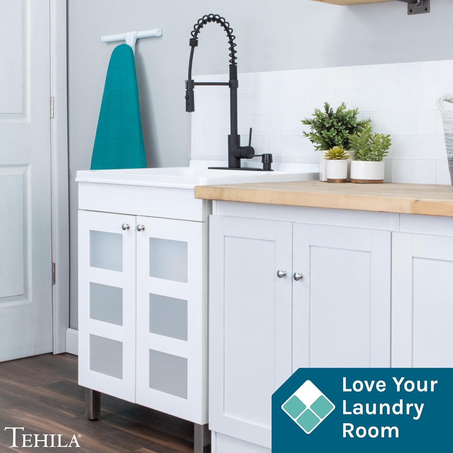 • Yes, you can love your Laundry Room! JS Jackson Supplies’ line of Tehila utility sink vanities, lend just the right touch of luxury and sophistication to your laundry space. The perfect blend of fashion and function, this classic vanity comes complete with a sleek black high-arc pull-down faucet, extra-deep laundry tub with built-in washboard, matching soap dispenser and strainer basket, adjustable metal legs, and p-trap kit. It’s a complete package!